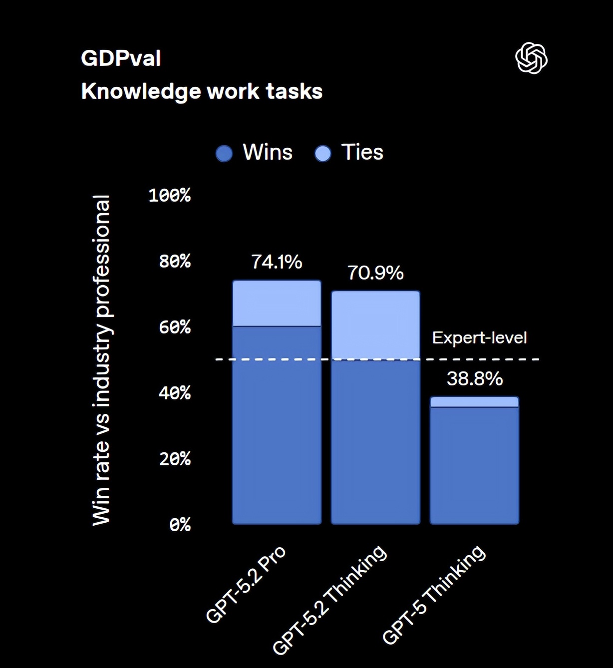 基于这些能力提升,OpenAI称为专业知识型工作打造的GPT-5.2是公司至今最强的模型,“GPT-5.2在众多基准测试中都刷新了行业水平,例如GDPval测试中,这款模型在涵盖44个职业的明确知识型工作任务中表现超过了行业专家。”